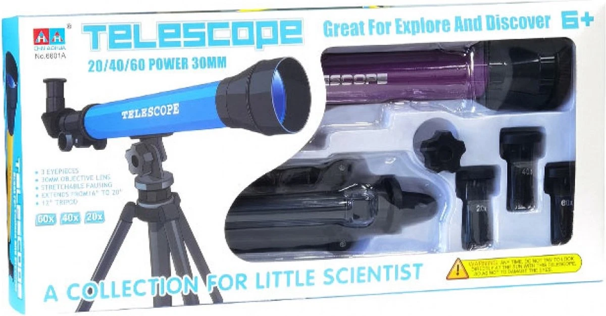Telescoop met 3 lenzen met echte functies, vergroting 20 – 40 – 60. Speciaal ontworpen voor kinderen. Ga nu rond de maan met de ongerichte beginnerstelescoop die speciaal is ontworpen voor kleuters. Inclusief statief. Diverse kleuren beschikbaar.( geel, grijs en blauw) Afmetingen: 43x 25x42cm. Bedrukte doos: 47x22x8 Graag even doorgeven voor de gewenste kleur!!